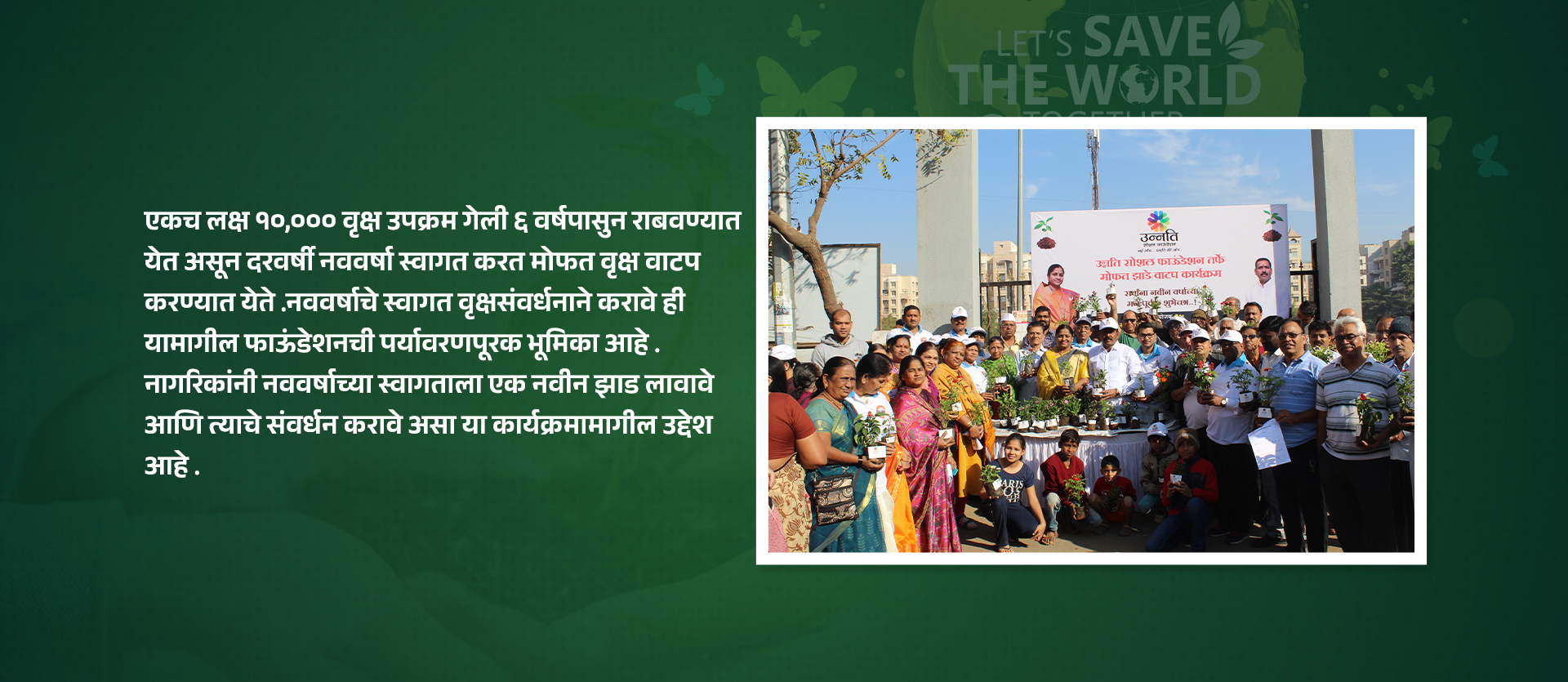 वनांचा मानवी जिवनाशी असलेला सरळ संबंध, जंगलावर अवलंबून असणारी प्राचीन औषध प्रणाली आणि सोबतच जंगलावर आपली उपजीविका भागवणाऱ्या जमाती आणि जैवविविधता याबाबत लोकांमध्ये जागरुकता पसरवण्यासाठी आणि जंगल निर्माण, संवर्धन आणि संरक्षणाच्या उद्देशांसाठी संयुक्त राष्ट्र संघाने २०१२ पासून २१ मार्च हा दिवस जागतिक वन दिन म्हणून साजरा करण्याचे ठरवले. उन्नती सोशल फाउंडेशन देखील वृक्ष संवर्धनासाठी कटिबद्ध असून, दरवर्षी १ जानेवारी ला नागरिकांना रोप वाटप करण्यात येते.